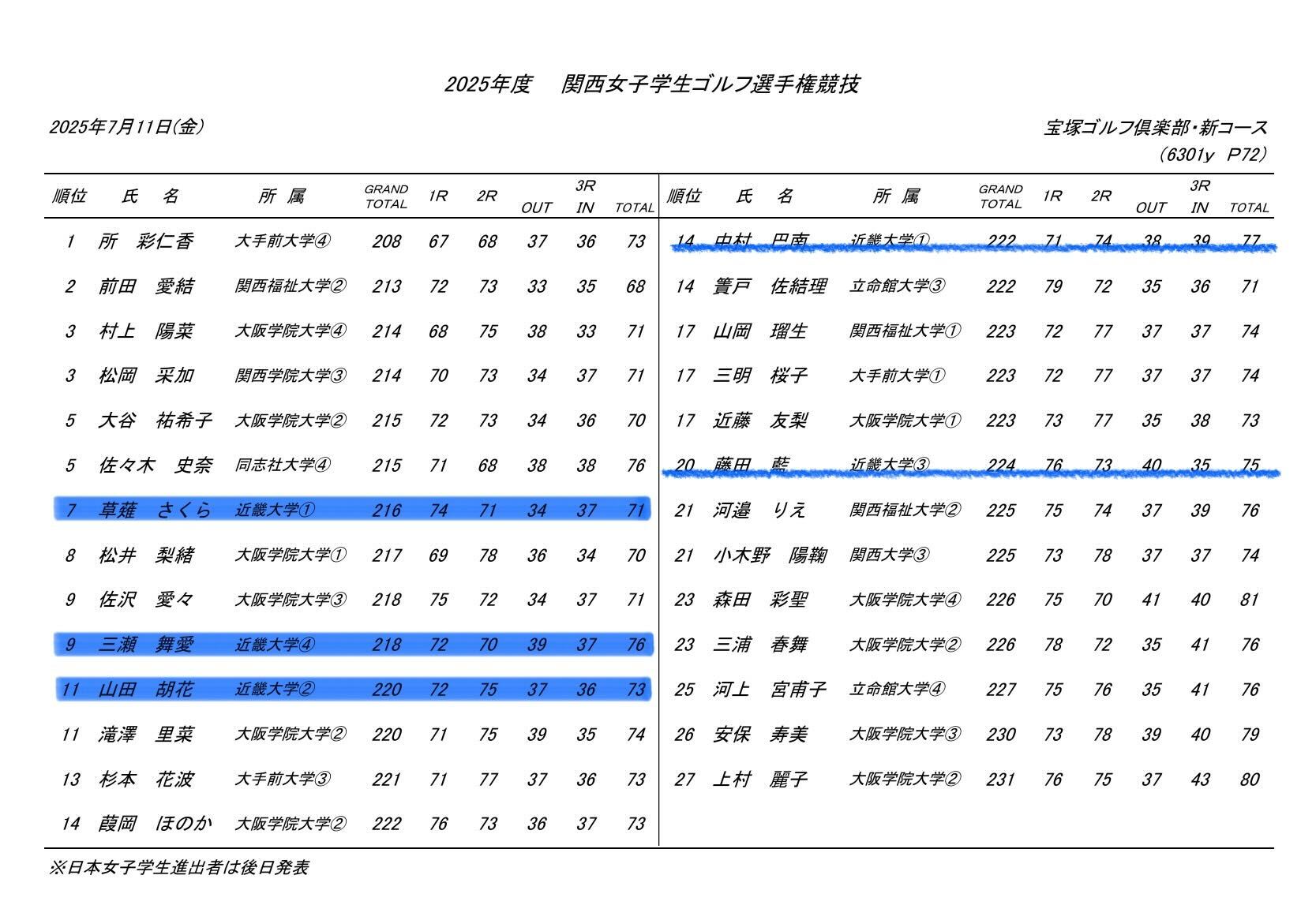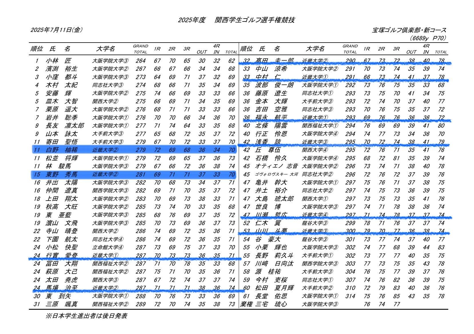 本日、宝塚ゴルフ俱楽部 新コースにて関西学生ゴルフ選手権競技・関西女子学生ゴルフ選手権競技の最終日が終了いたしましたので、結果をご報告いたします。