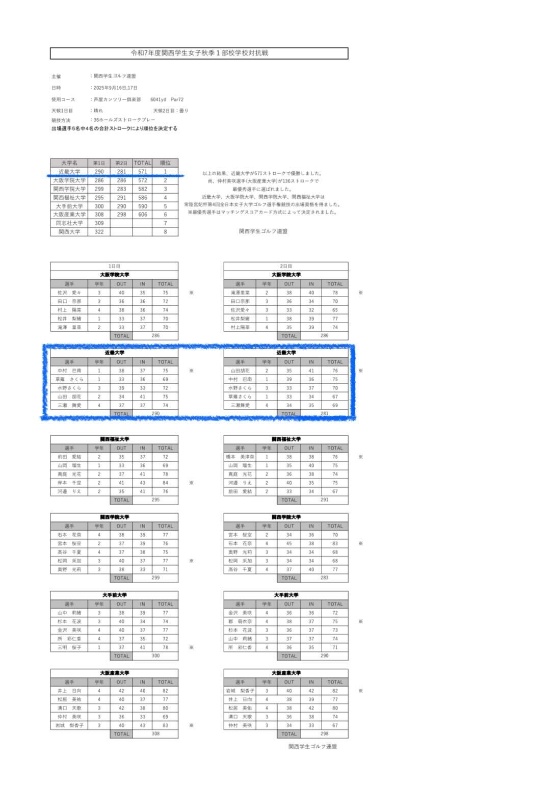 本日、芦屋カンツリー俱楽部にて令和7年度関西学生女子秋季1部校学校対抗戦 が行われましたので、結果をご報告いたします。