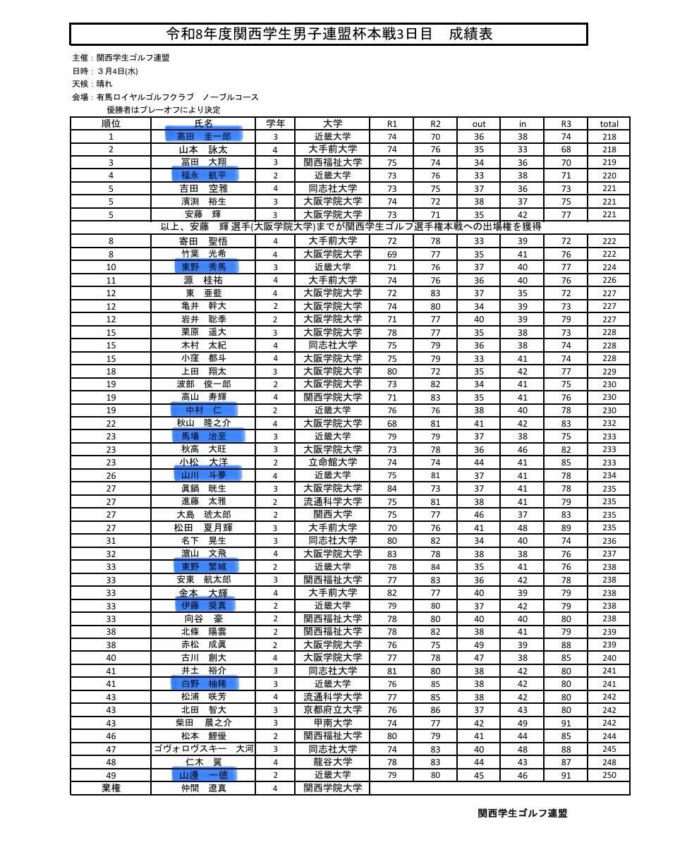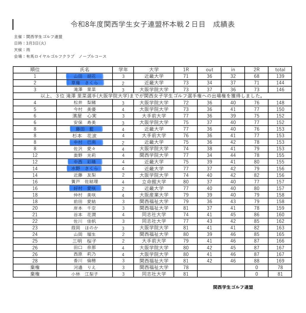 本日、有馬ロイヤルゴルフクラブ ノーブルコースにて令和8年度関西学生連盟杯本戦が行われましたので、結果をご報告いたします。