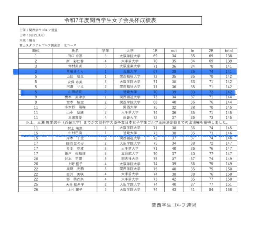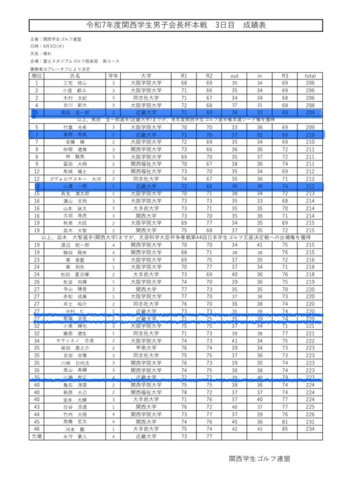 本日、富士スタジアムゴルフ倶楽部にて令和7年度関西学生会長杯の最終日が終了いたしましたので、結果をご報告いたします。