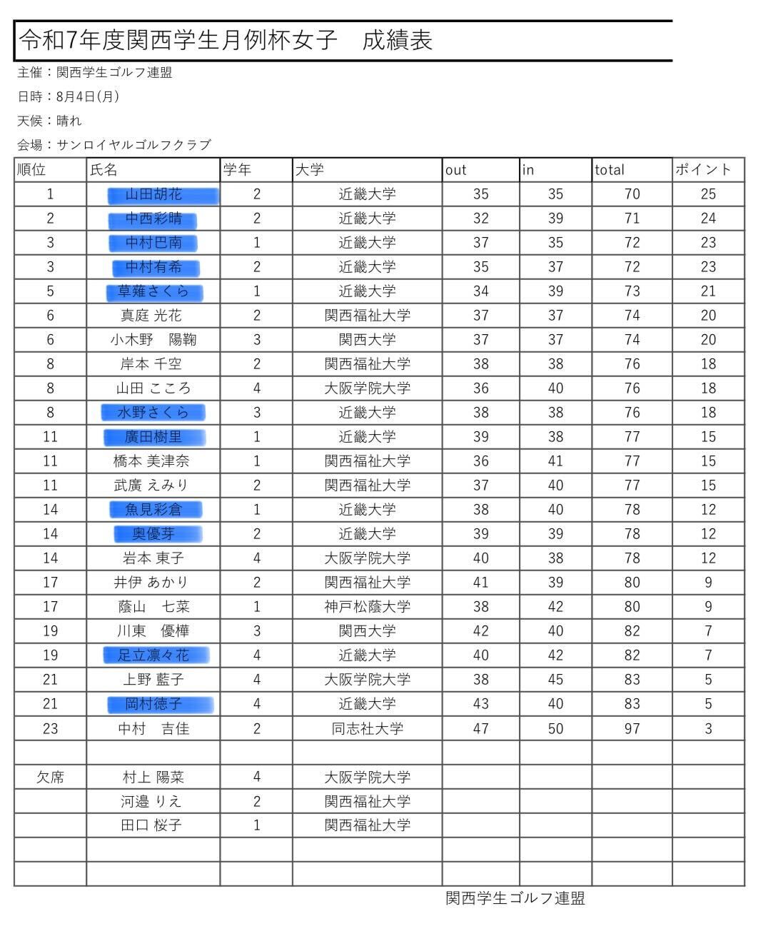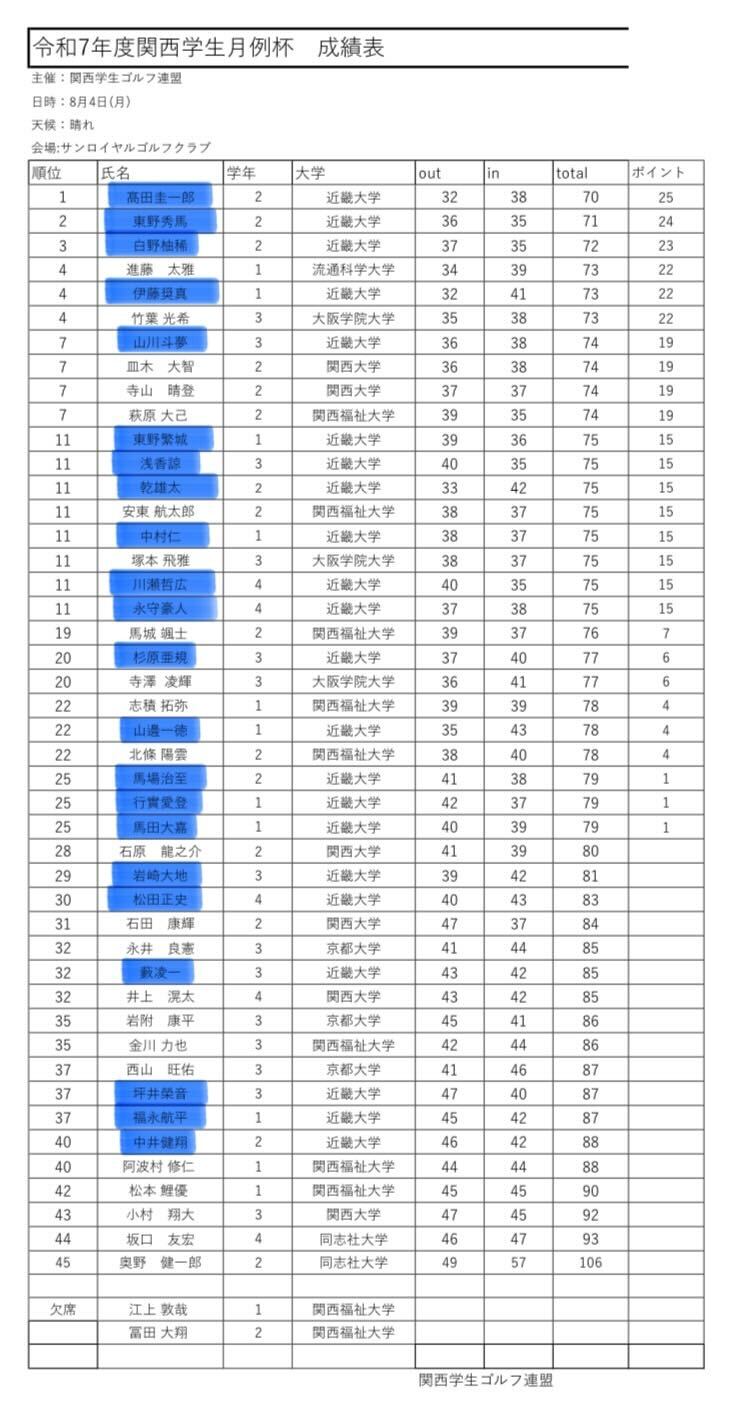 本日、サンロイヤルゴルフクラブ にて令和7年度関西学生8月度月例杯が行われましたので、結果をご報告いたします。